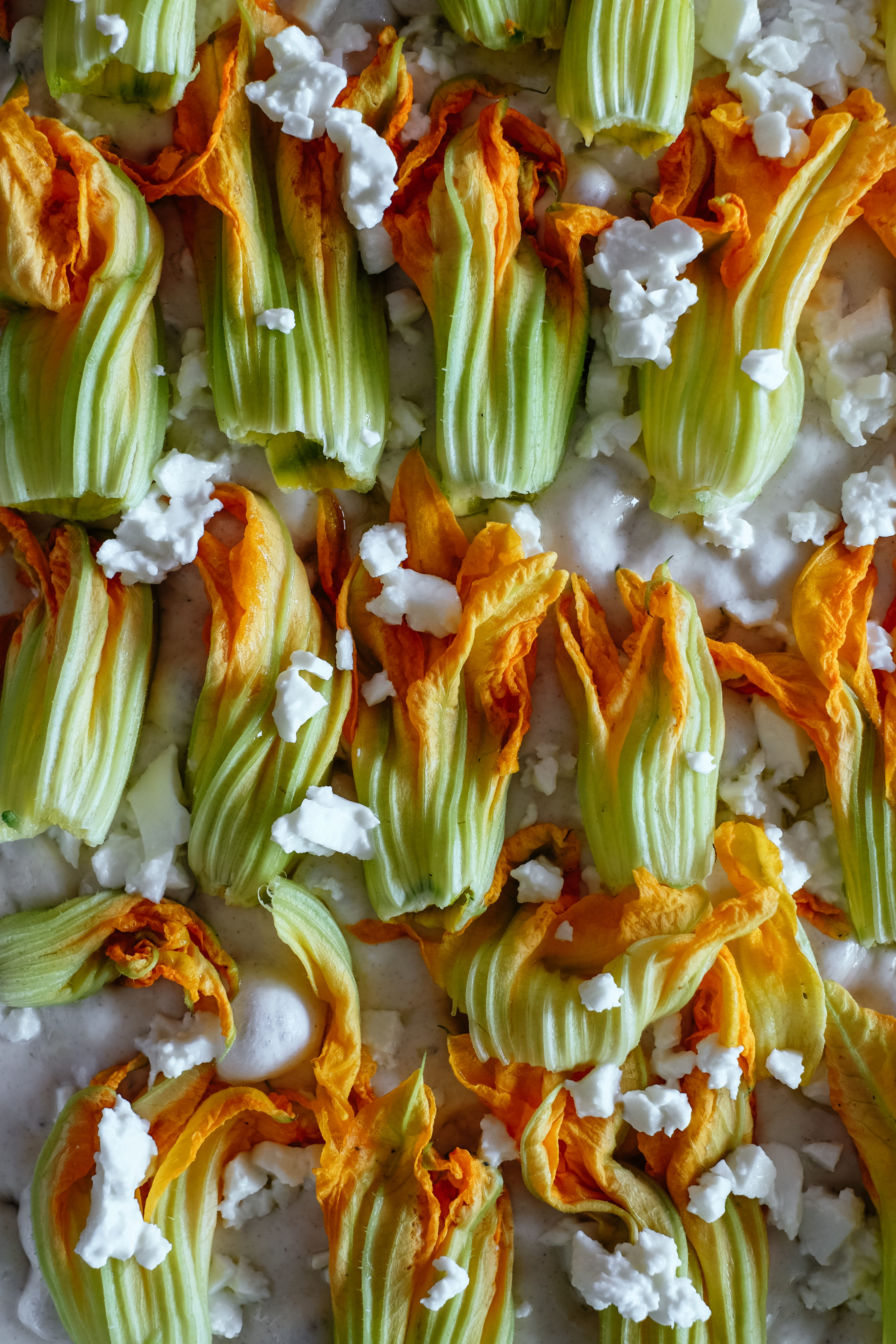 Passata l’ultima fase di maturazione, metti un filo di olio e cospargi con la mozzarella, prosegui con i fiori di zucca disponendoli uno di fianco all’altro su 4 file.
