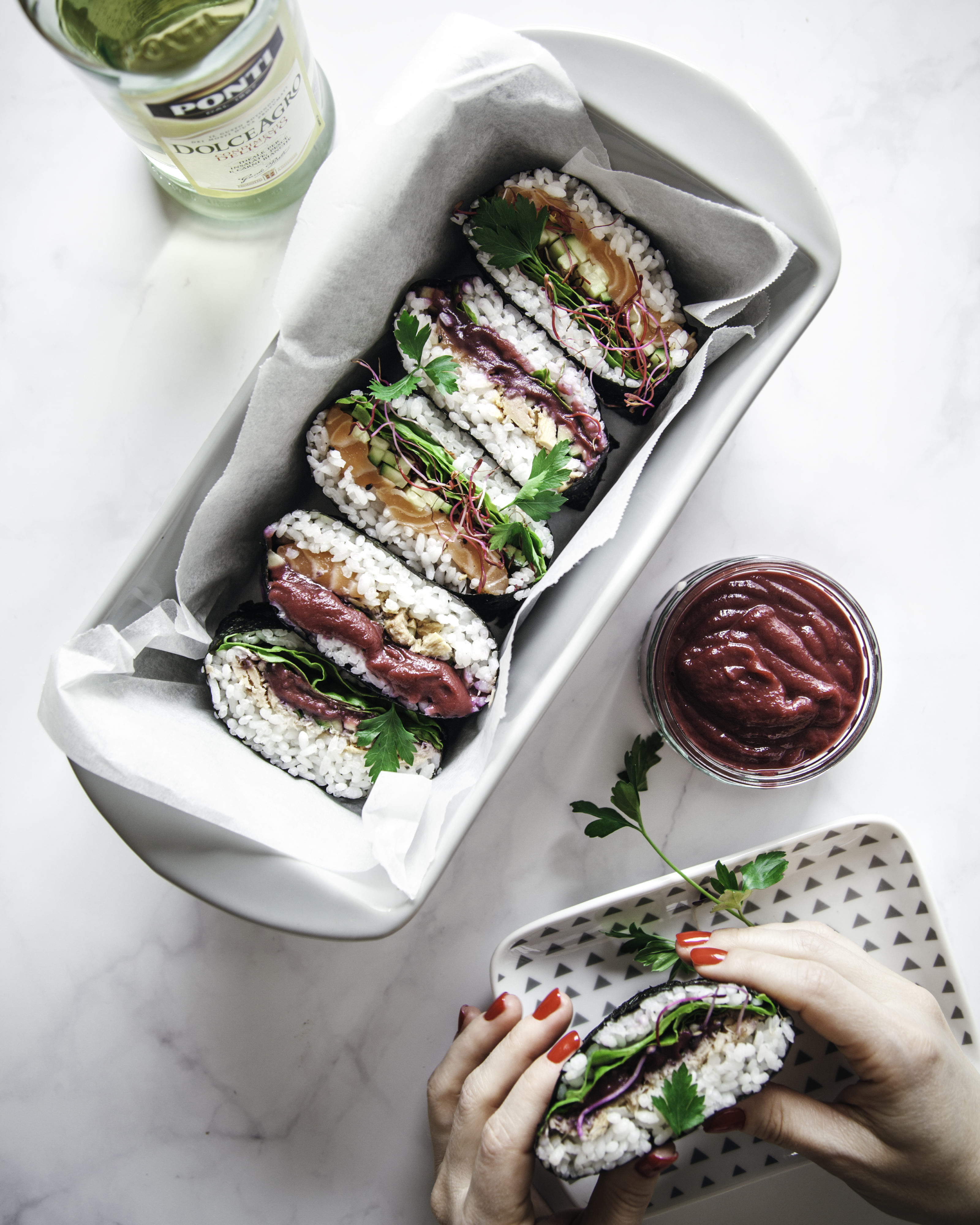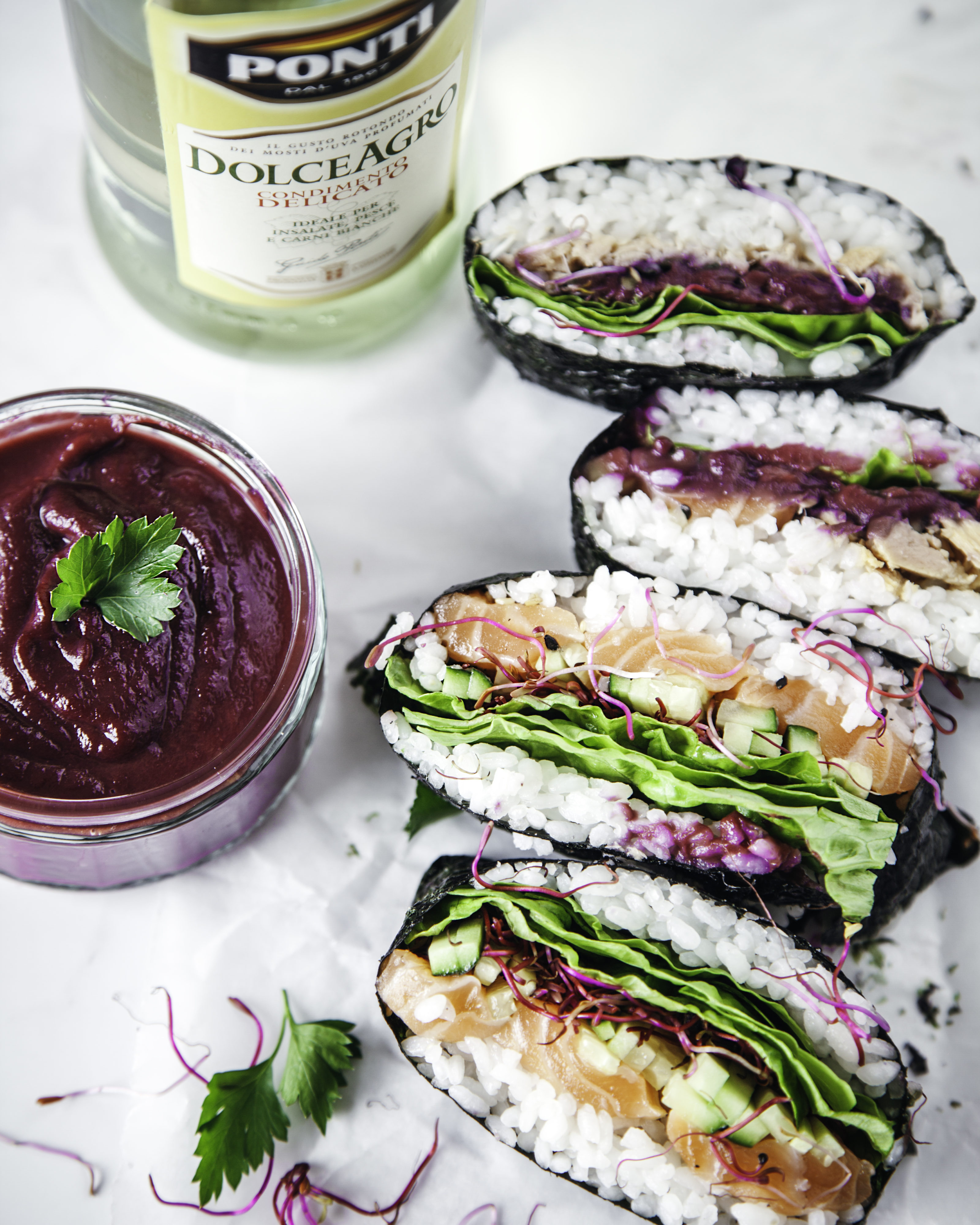 Visto che la primavera tarda ad arrivare, ho pensato di riempire la mia gallery di colori, e di sognare un bel pic nic sul lago. L’ispirazione mi ha portato a preparare questi bellissimi Salmon & tuna Onigirazu Aka Sandwich Giapponese con ketchup di carote viola al Dolce Agro Ponti. Un’esplosione di colori e di gusto! Li potete modificare come più vi piace, dal total Veg alla carne, abbinando i vostri gusti pereferiti. Vi consiglio di provare la versatilità del condimento delicato Dolce Agro, anche per un Ketchup classico, il tocco in più che fa la differenza.
