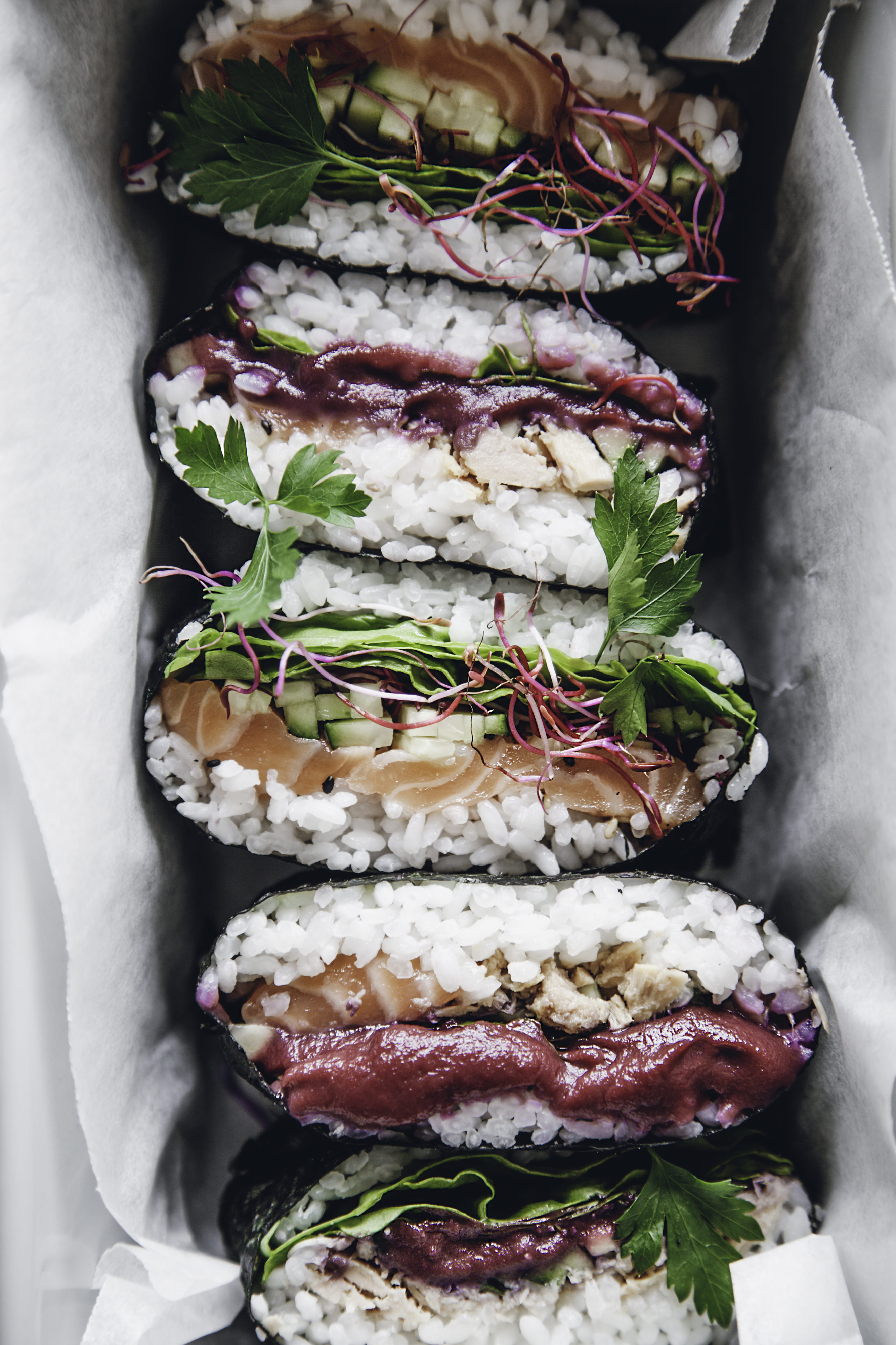 Prendi l’alga nori posizionala sopra ad una pellicola per alimenti, al centro aggiungi il riso formando un quadrato, adagia il tonno oppure il salmone, poi il cetriolo, il ketchup di carote viola, la lattuga e per finire ancora il riso. Chiudi i lembi dell’alga formando un saccottino, sigilla bene con la pellicola e aspetta qualche minuto prima di aprire. Trascorso il tempo, elimina la pellicola taglia a metà il sandwich con un coltello ben affilato e servi subito! Puoi conservarlo in frigo per 1 giorno.