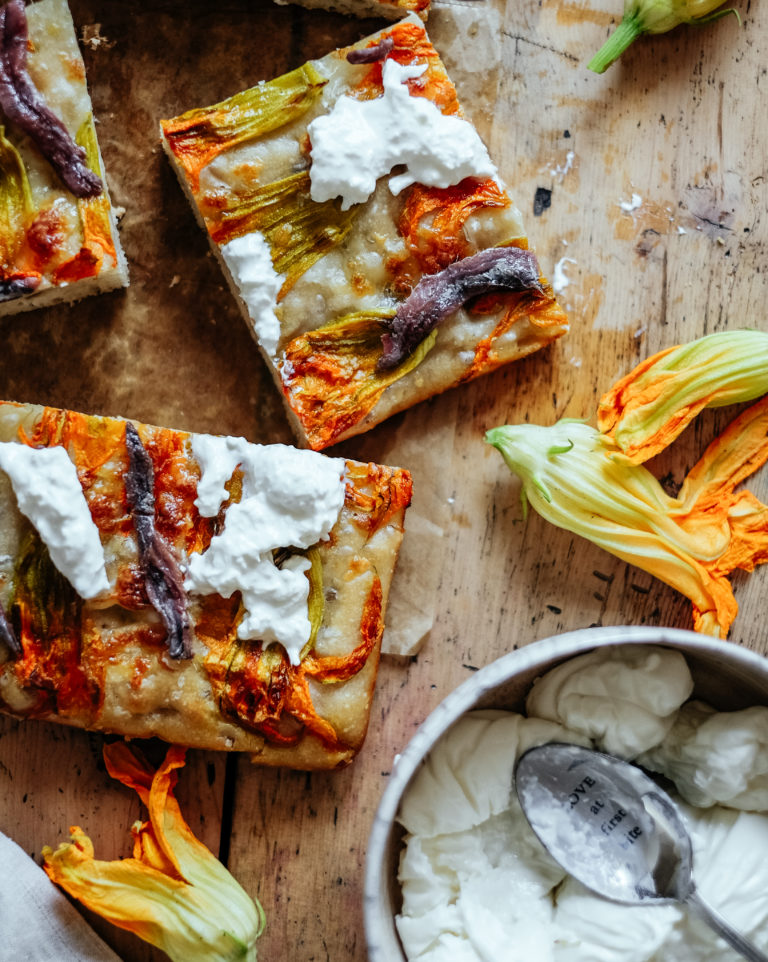 Focaccia con fiori, acciughe e burrata.