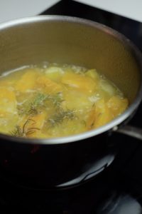 Nel frattempo prepara il fondo della vellutata, sbucciando le patate e i porri a fettine di egual misura ed adagiando il tutto nella casseruola con un filo d’olio, rosola leggermente poi aggiungi acqua fino a coprire.